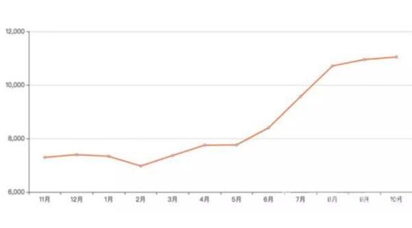 在多種因素的作用下,貴陽房?jī)r(jià)開啟狂奔模式。吉屋網(wǎng)的數(shù)據(jù)顯示,2018年10月,貴陽的新房均價(jià)為11172元/平方米,而去年同期僅為7377元/平方米,一年時(shí)間內(nèi)漲幅超過50%。