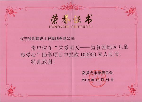 2019年10月24日,我集團積極參與葫蘆島市教育局、葫蘆島市民政局、葫蘆島市慈善總會“關(guān)于開展‘關(guān)愛明天——為貧困地區(qū)兒童獻愛心’公益活動的倡議”活動,捐款人民幣拾萬元整。