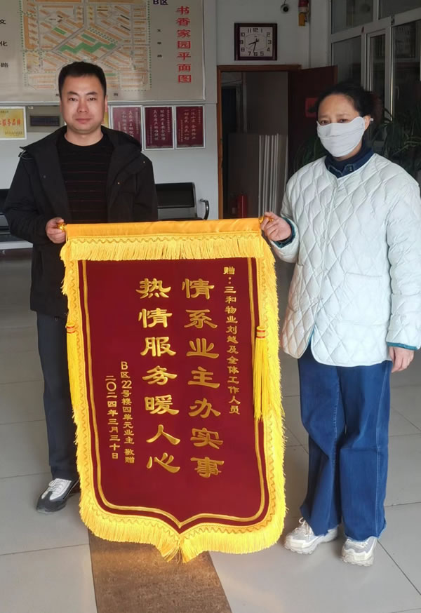 近日,書香家園B區(qū)一業(yè)主親手將一面繡有“情系業(yè)主辦實(shí)事 熱情服務(wù)暖人心”的錦旗贈(zèng)送給三和物業(yè)團(tuán)隊(duì),以表達(dá)對(duì)他們?cè)谔幚硐滤蓝氯麊栴}上所展現(xiàn)出的高效服務(wù)和專業(yè)務(wù)實(shí)態(tài)度的高度贊揚(yáng)與深深感謝。