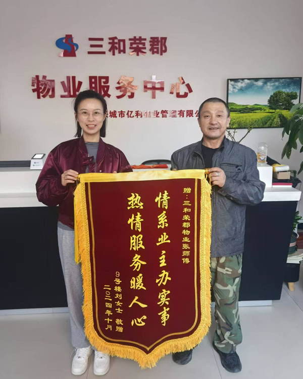 10月25日,業(yè)主劉女士將一面繡有“情系業(yè)主辦實(shí)事 熱情服務(wù)暖人心”字樣的錦旗送到了三和榮郡物業(yè)服務(wù)中心,對(duì)維修師傅張興軍及時(shí)解決水管漏水問(wèn)題表示感謝。