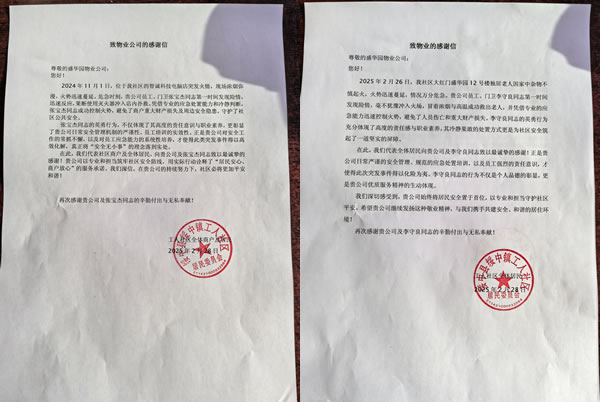 近期,綏中縣盛華園小區(qū)先后發(fā)生兩起火災(zāi)事故,所幸均被物業(yè)員工及時妥善處理,成功避免了重大人員傷亡和財(cái)產(chǎn)損失,綏中鎮(zhèn)工人社區(qū)居委會為此向盛華園物業(yè)公司發(fā)來感謝信,對兩位員工的英勇行為表示高度贊揚(yáng)。