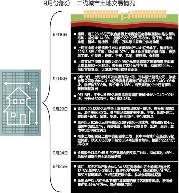 同樣的情況也發(fā)生在其他城市。9月23日,南京土地拍賣會(huì)上集中競(jìng)拍四宗土地,其中中海地產(chǎn)在經(jīng)過89輪競(jìng)價(jià)后,以20.8億元拿下城北G34商住混合地塊,樓面價(jià)22373元/平方米,創(chuàng)造了南京的樓面價(jià)新高。9 月24日,金隅股份以總價(jià)45.51億元競(jìng)得合肥叉車廠地塊,溢價(jià)率達(dá)148%,總價(jià)格創(chuàng)下合肥土地總價(jià)新高。在廈門,9月25日一向行事穩(wěn)健的龍湖地產(chǎn)以45億元拿下廈門馬鑾灣西部片區(qū)5商住地塊,樓面價(jià)15679.44元/平方米,溢價(jià)率66.79%,無論是總價(jià)還是樓面價(jià)格都創(chuàng)造了廈門當(dāng)?shù)氐男赂摺?/FONT>